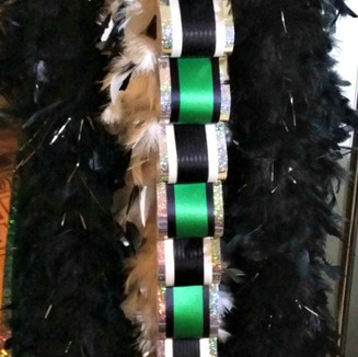 At this stage in my design, the vision starts to take shape. We start to add the sparkle that makes the mum special. Below you will see where we left off in the last part of our story. The body has shape, we have added a layer of fullness with our boas. From here we will begin to add our decorated ribbons, braids and final touches. You can see below side by side as the skirt begins to take it form. From left to right you can see the progression of the design process.